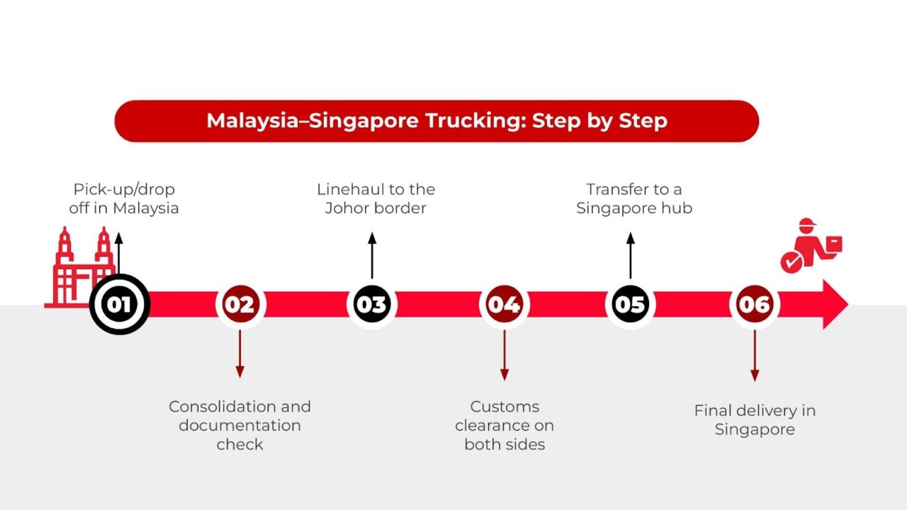 Cross-border trucking from Malaysia to Singapore moves palletised commercial freight from major hubs such as Kuala Lumpur, Johor Bahru, and Penang directly into Singapore using scheduled trucks.